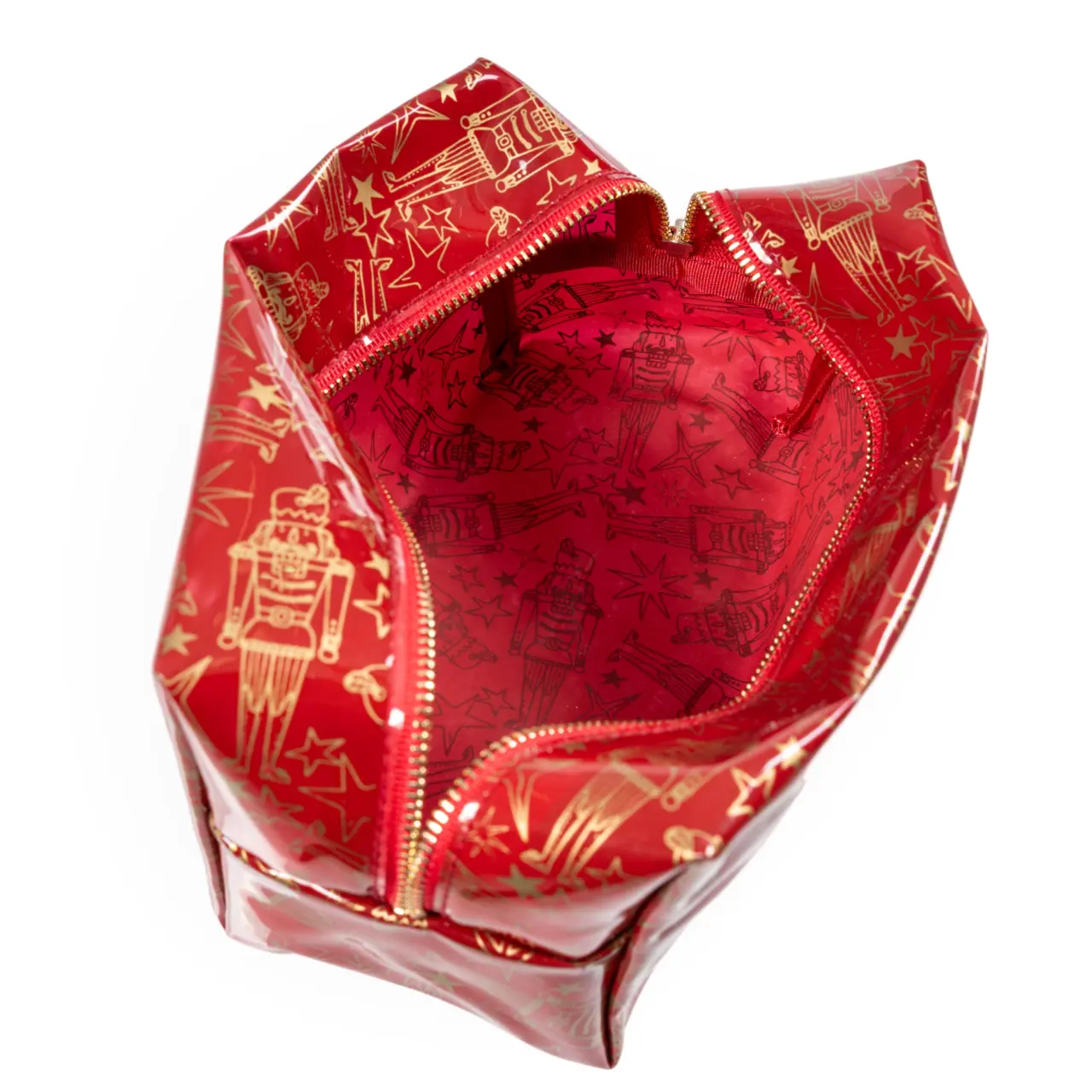 Kosmetyczka w atrakcyjnym czerwonym kolorze z motywem Dziadka do orzechów, nawiązującego do świat Bożego narodzenia, jest wspaniałym gadżetem dla każdego użytkownika.