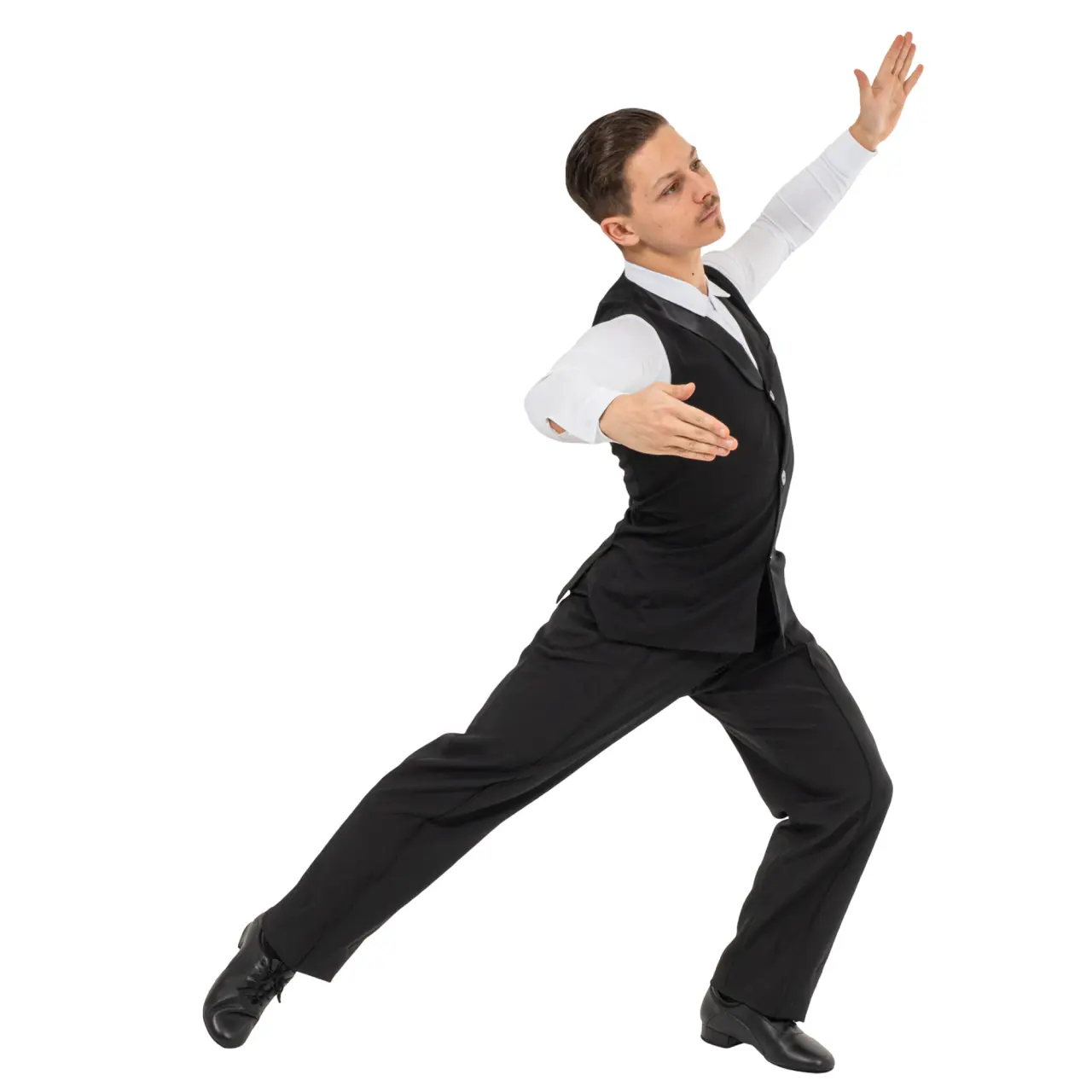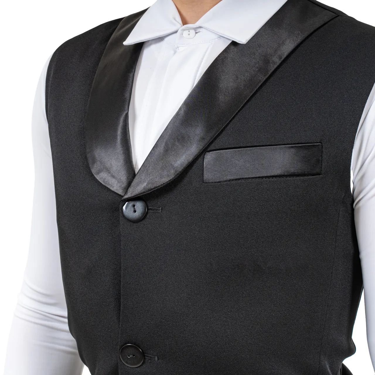Męska kamizelka do tańców standardowych Eliot z klapami wykończonymi delikatnym satynem dodaje tancerzowi elegancki i luksusowy wygląd.