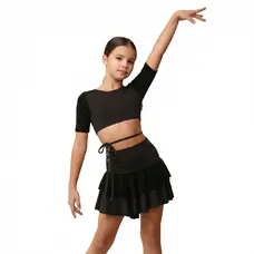Elastyczny materiał z mikropoliamidu delikatnie dopasowuje się do ciała, zachowuje swój kształt i zapewnia maksymalną swobodę podczas tańca. Elementy dekoracyjne nadają topowi wyjątkową teksturę i podkreślają linie ramion oraz talii, tworząc efektowny wizualny efekt na treningu i na scenie.