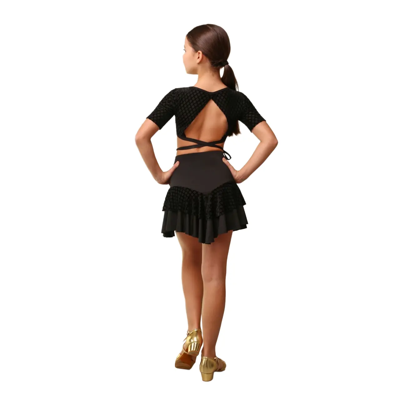 Dziewczęcy top taneczny Iona z kolekcji MINI NOIR wyróżnia się eleganckim designem przeznaczonym do tańców latynoamerykańskich. Wyraziste otwarte plecy w połączeniu z regulowanym wiązaniem umożliwiają dopasowanie do potrzeb, a jednocześnie pewnie utrzymują się podczas ruchu.