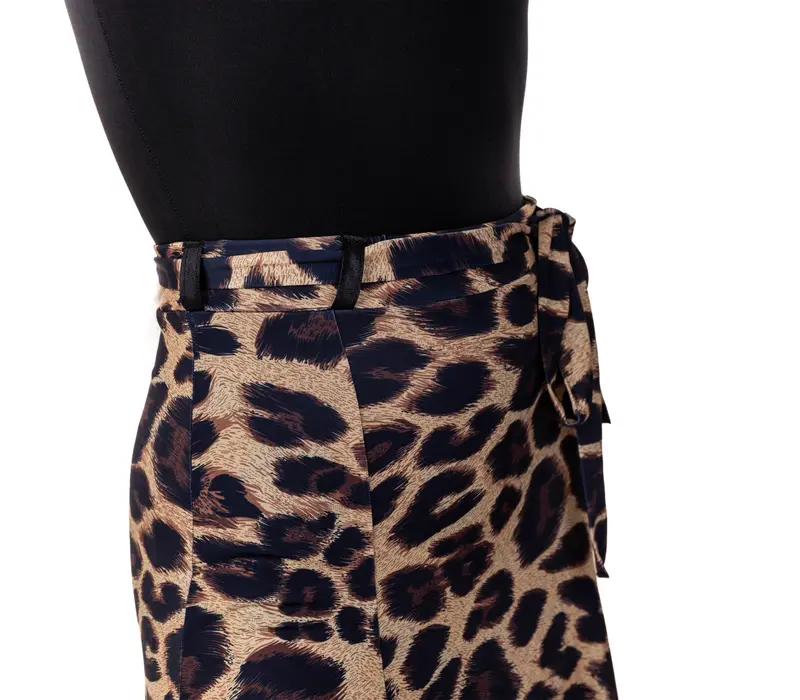 Wyrafinowana spódnica z pięciu części, poszerzana u dołu, posiada w płaskim pasie satynowe szlufki (szerokość ok. 3 cm) oraz materiałowy pasek wykonany z tego samego materiału co spódnica. Jest nieco krótsza z przodu i pozwala podkreślić pracę kolan. Materiał poliamid, elastan, spandex.